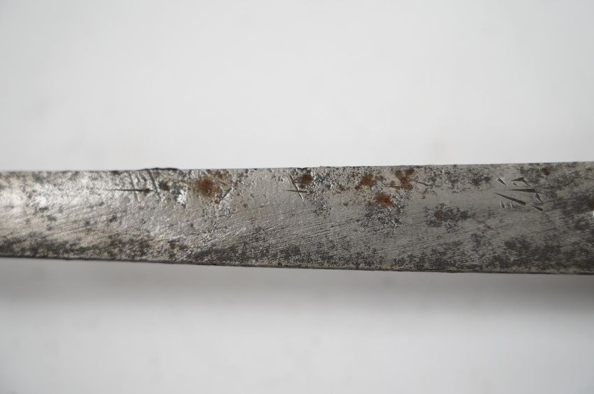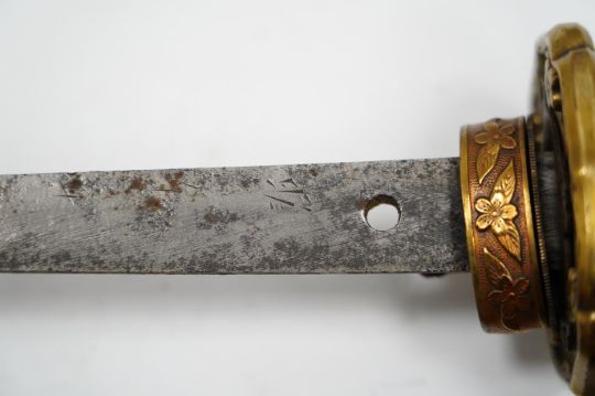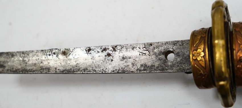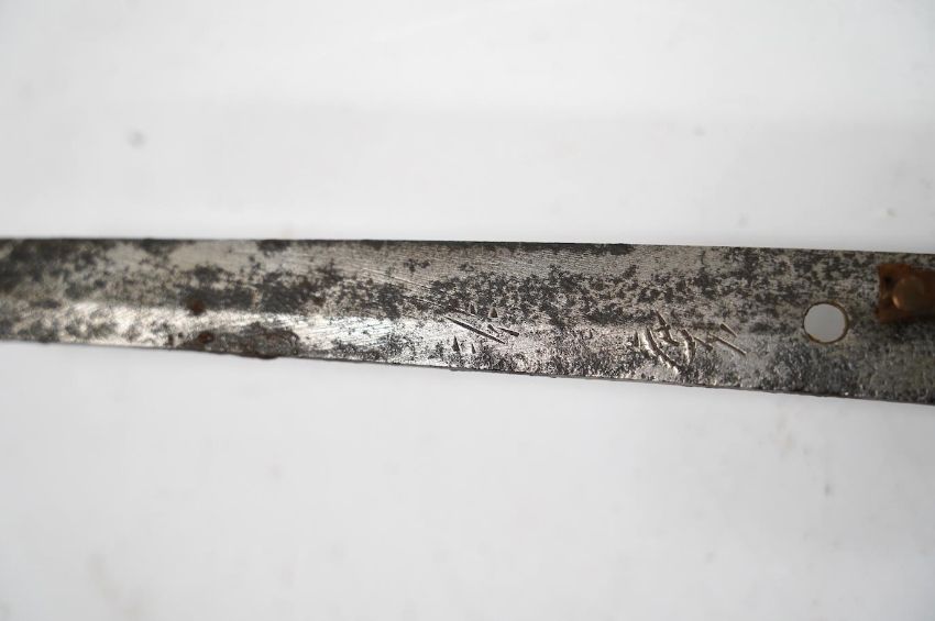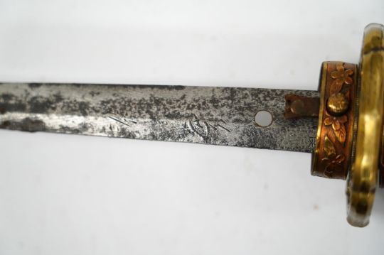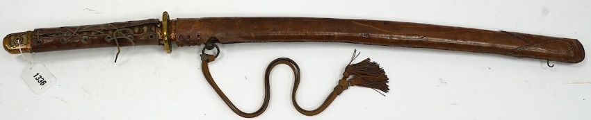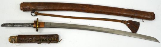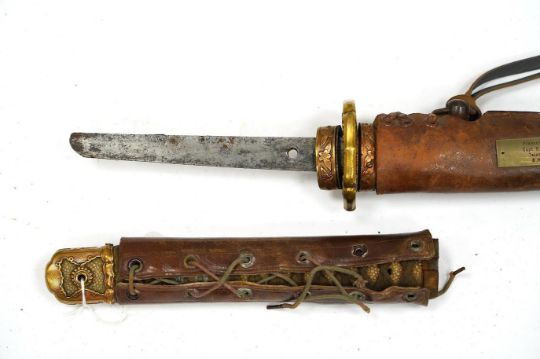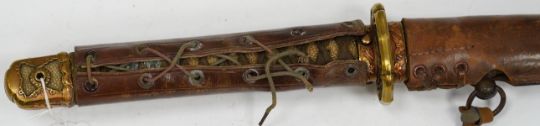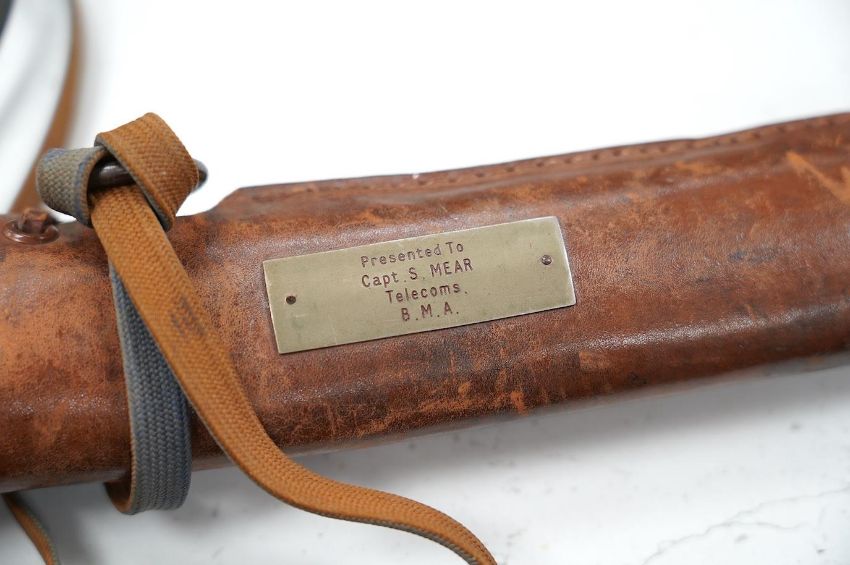 A Japanese WWII army officer’s sword Katana, blade 57.9cm, signed and dated with Seki Arsenal stamp, retaining good polish, in shin gunto mounts with leather combat cover on hilt and scabbard, the latter with plate stamped; ‘presented to Capt. S. Mear telecoms B.M.A.’ complete with brown and blue dress knot * Due to new safety regulations and legal restrictions with ParcelForce and Royal Mail, we are unable to pack or send swords and bladed items through postal service. Collection in person or courier service is recommended *
