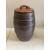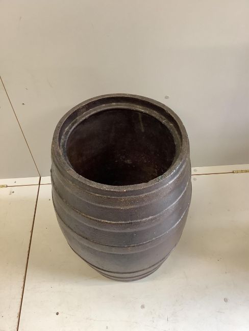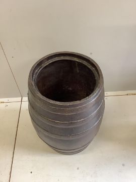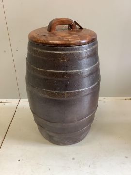 A Victorian salt glazed earthenware barrel with associated wood cover, diameter 40cm, height 73cm. Condition - good
