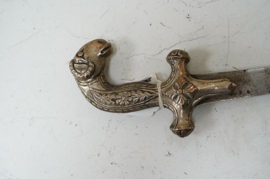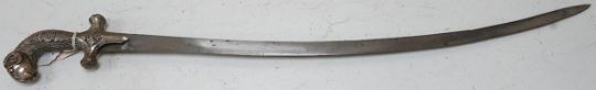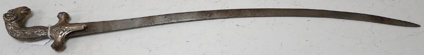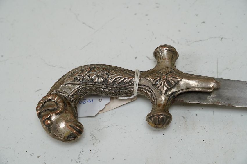 A decorative Indian sword, Shamshir hilt of embossed silver plated copper with a rams head pommel, blade 73.5cm. Condition - good * Due to new safety regulations and legal restrictions with ParcelForce and Royal Mail, we are unable to pack or send swords and bladed items through postal service. Collection in person or courier service is recommended *