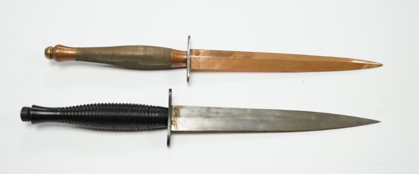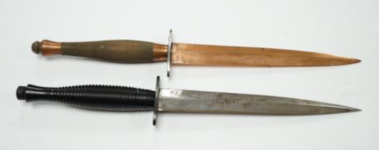 Two Fairburn Sykes style daggers, one copper plated, guard of the other stamped William Rogers, Sheffield, England. Condition - good * Due to new safety regulations and legal restrictions with ParcelForce and Royal Mail, we are unable to pack or send swords and bladed items through postal service. Collection in person or courier service is recommended *