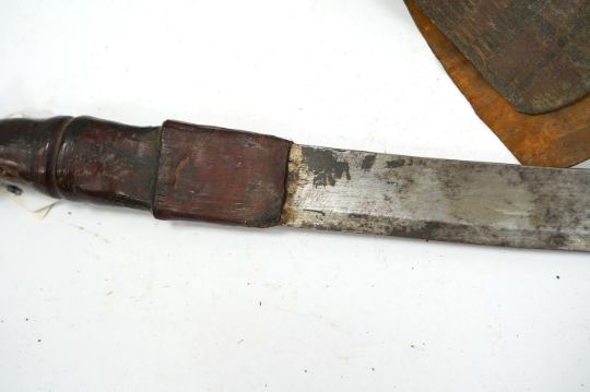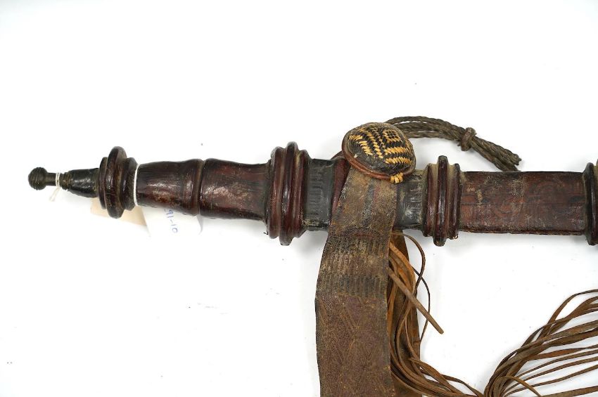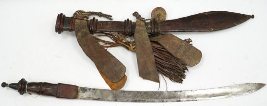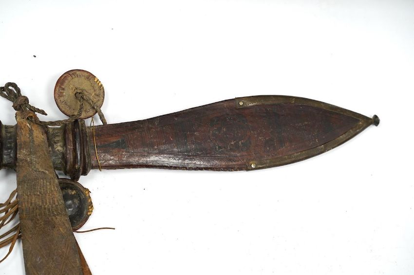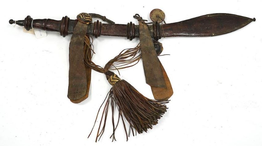 A late 19th century Nigerian Taboura from the Hausa People of Northern Nigeria, in leather scabbard, blade 59.5cm. Condition - good * Due to new safety regulations and legal restrictions with ParcelForce and Royal Mail, we are unable to pack or send swords and bladed items through postal service. Collection in person or courier service is recommended *