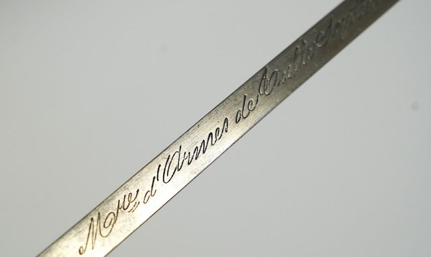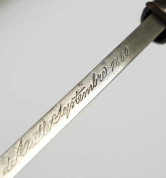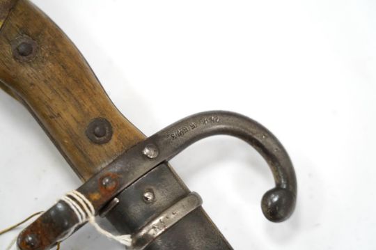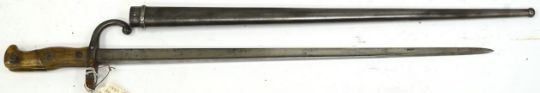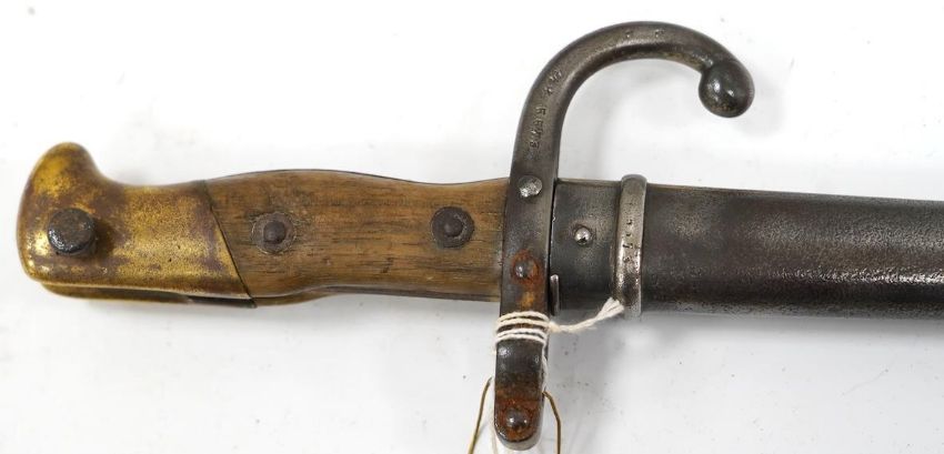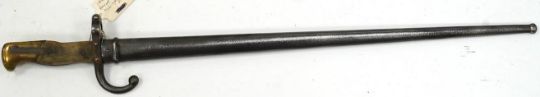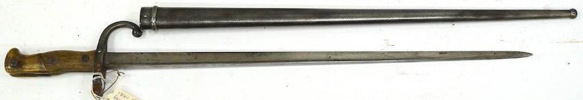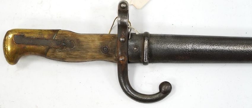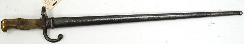 An 1880 French bayonet and scabbard for a Gras rifle. Condition - good, some pitting * Due to new safety regulations and legal restrictions with ParcelForce and Royal Mail, we are unable to pack or send swords and bladed items through postal service. Collection in person or courier service is recommended *