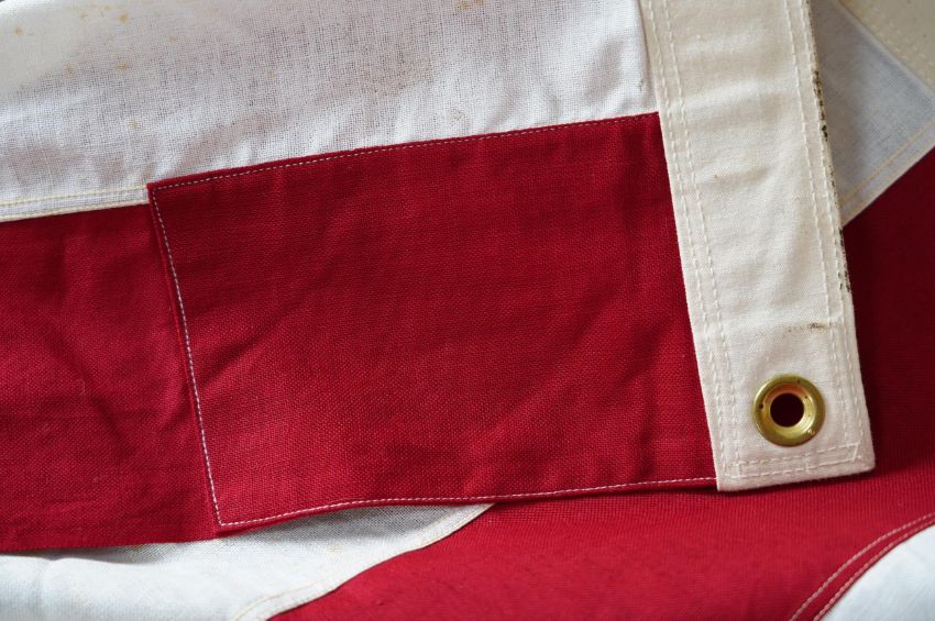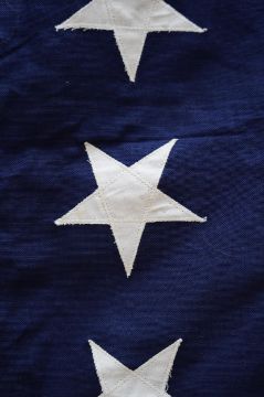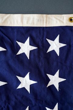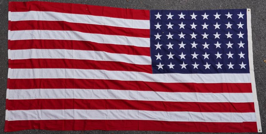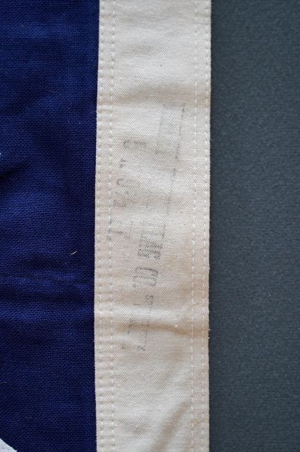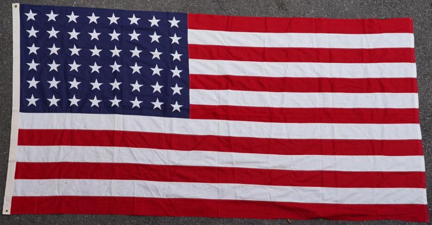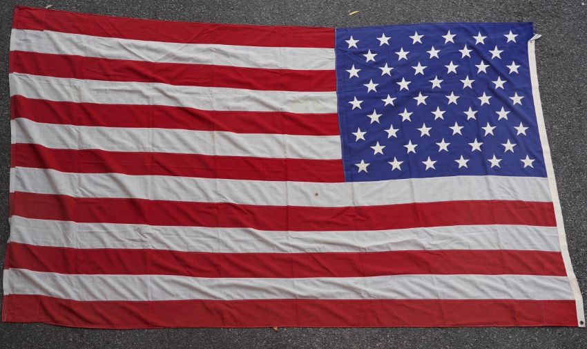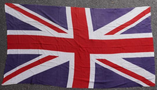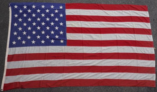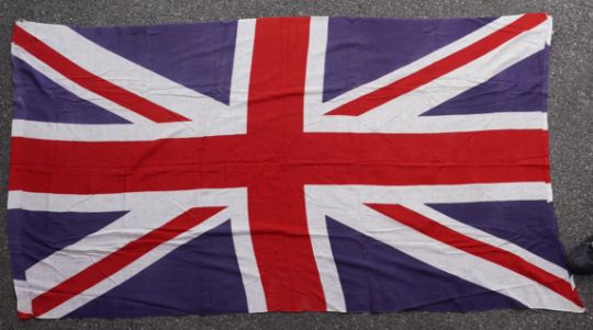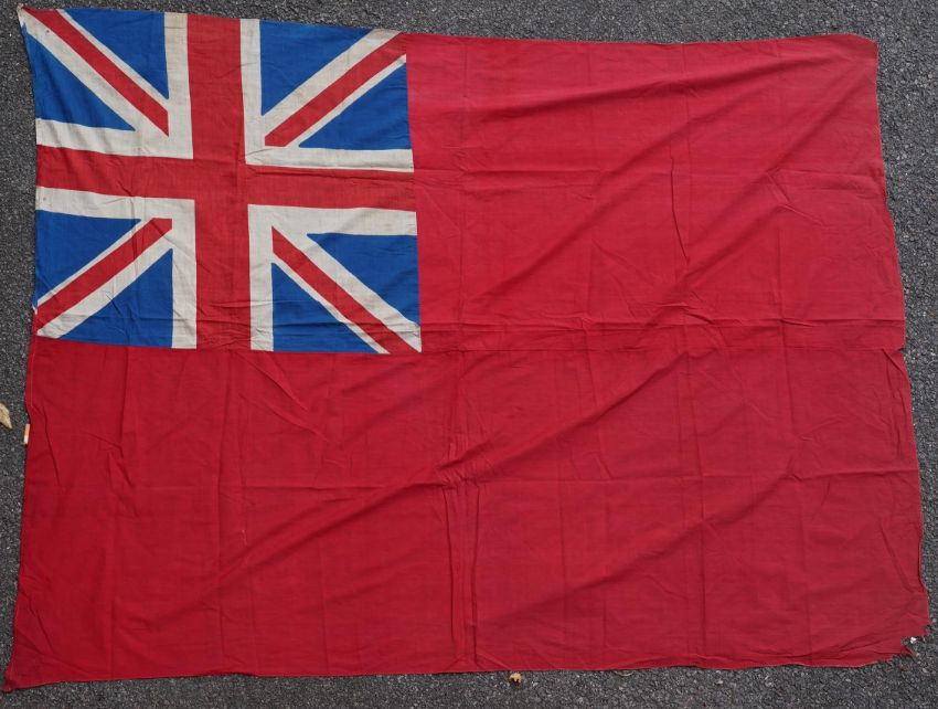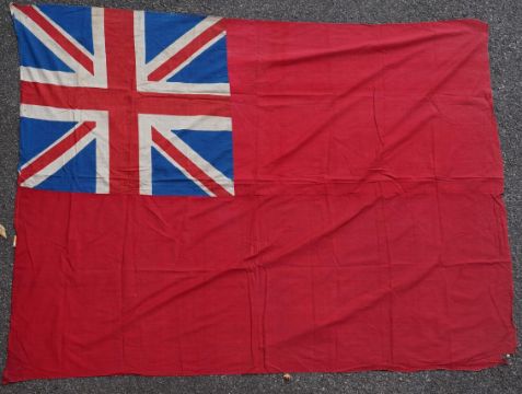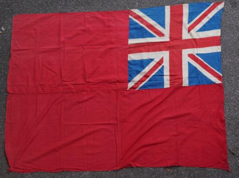 Four flags; two professionally made US Stars and Stripes, both on thick canvas with applied stars and joined stripes, one by the Valley Forge Flag Co., Pennsylvania, stamped “5 x 9.5 ft”, 146 x 288cm and 176 x 300cm, together with a Merchant Navy Red Ensign, 144 x 190cm, and a Union Flag (Union Jack), 116 x 204cm. Condition - fair to good, some fraying to the smaller flags, etc.