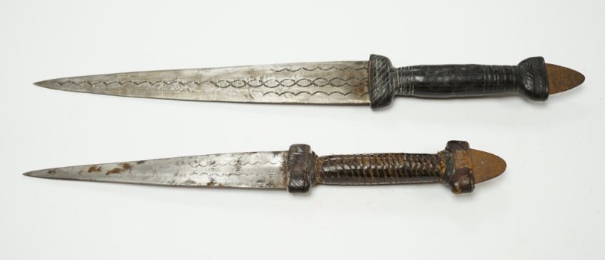 Two African Tuareg arm daggers, with leather grips and leather sheaths, longest blade 20cm. Condition - good * Due to new safety regulations and legal restrictions with ParcelForce and Royal Mail, we are unable to pack or send swords and bladed items through postal service. Collection in person or courier service is recommended *