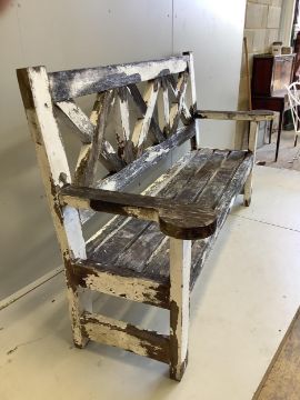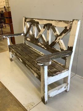 A 'country house' weathered teak garden bench, width 193cm, depth 60cm, height 110cm. Condition - fair