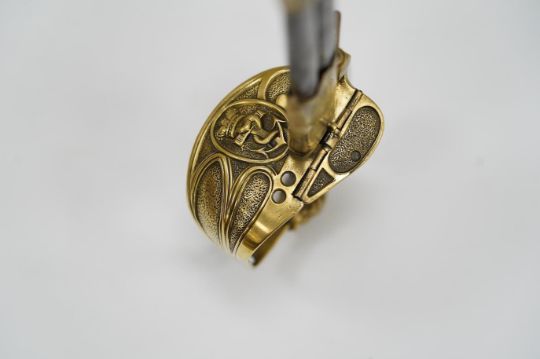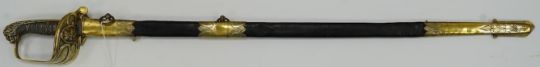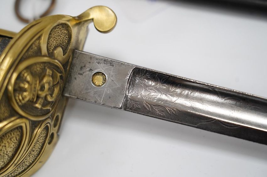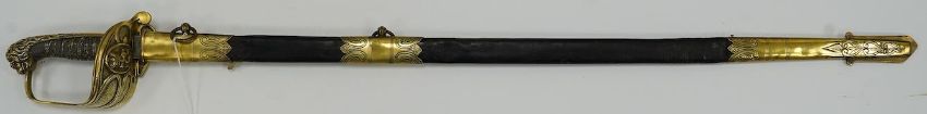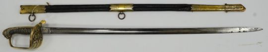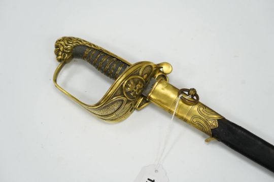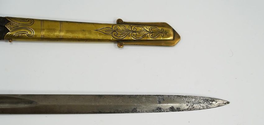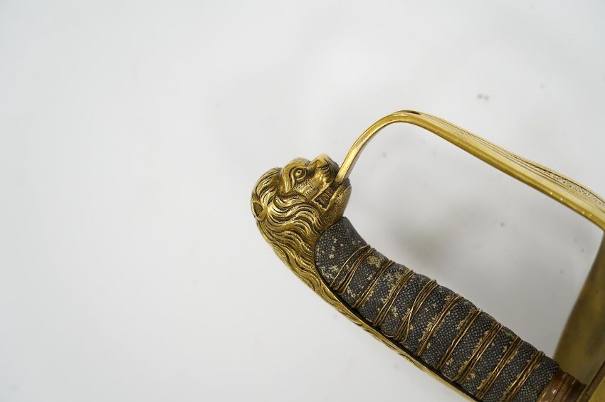 A Victorian warrant officer's sword by Westcott and Sons, regulation brass hilt, black fish skin covered grip, in its brass mounted leather scabbard, blade 79.5cm. Condition - well worn * Due to new safety regulations and legal restrictions with ParcelForce and Royal Mail, we are unable to pack or send swords and bladed items through postal service. Collection in person or courier service is recommended *