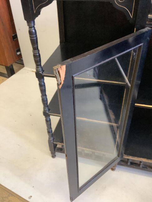 A late Victorian Aesthetic Movement ebonised side cabinet, width 167cm, depth 43cm, height 105cm. Condition - poor