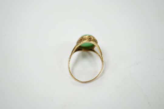 A Chinese 18k and cabochon jade set ring, size O, gross weight 3.9 grams. Condition - poor