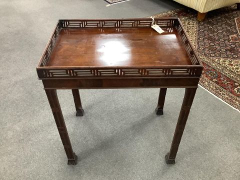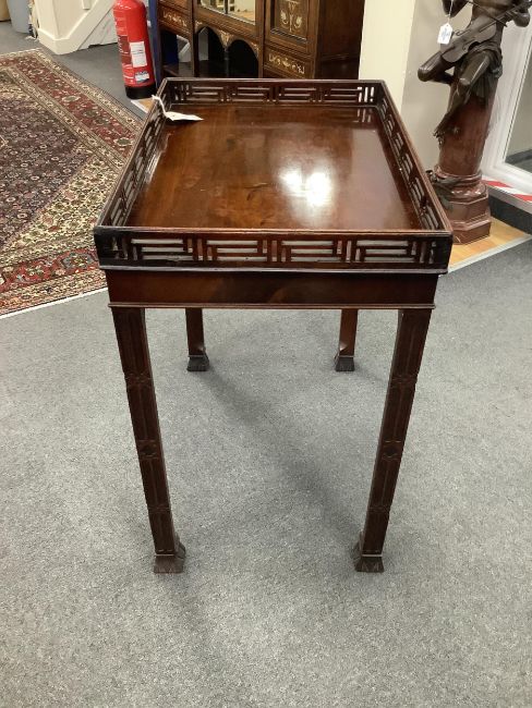 A George III Chippendale period rectangular mahogany silver table with white metal presentation plaque, width 64cm, depth 44cm, height 73cm. (restored). Condition - good