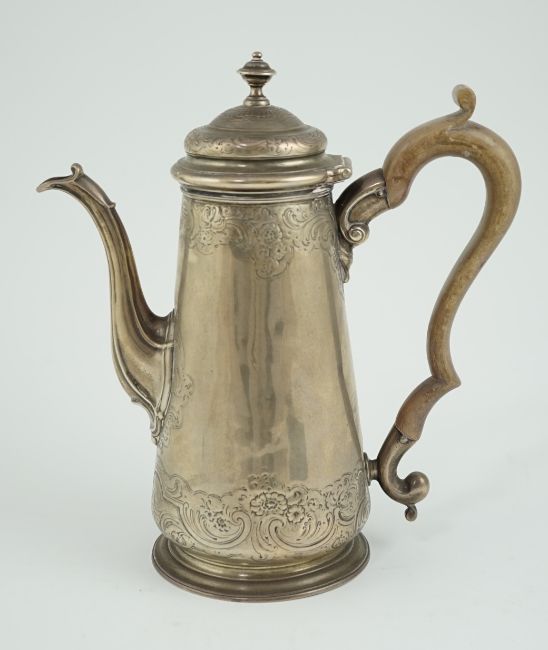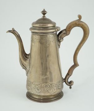 A George II silver coffee pot with later engraved decoration, Robert Tyrrill, on circular foot, London, 1746, height 23.3cm, gross weight 23.9oz.