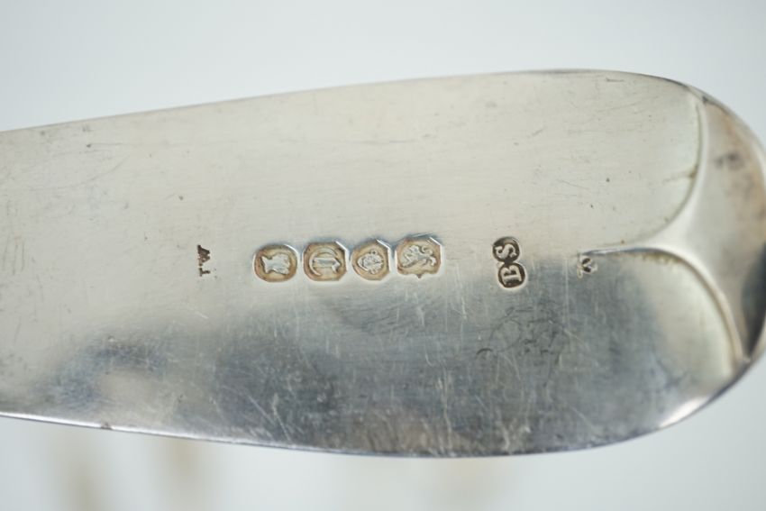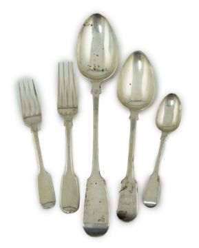 A large quantity of assorted mainly 19th century and later silver and white metal flatware, various dates, patterns and makers, including a set of six fiddle pattern table forks by Hayne & Cater, London, 1838 and a similar basting spoon by Benjamin Smith III, London, 1838, weighable silver 155 oz. Condition - poor to fair.