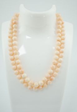 A double strand pale pink coral bead choker necklace, with round and baguette cut diamond cluster set bow shaped 18k white gold clasp, 35cm.