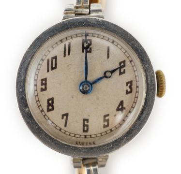 A lady's George V 18ct gold and platinum manual wind wrist watch, with Arabic dial, on a 14ct and platinum flexible bracelet, gross weight 20.6 grams.