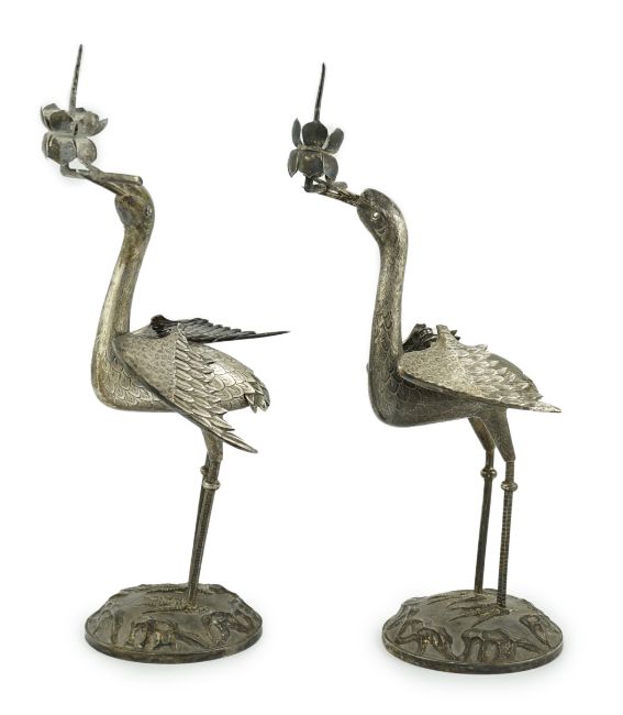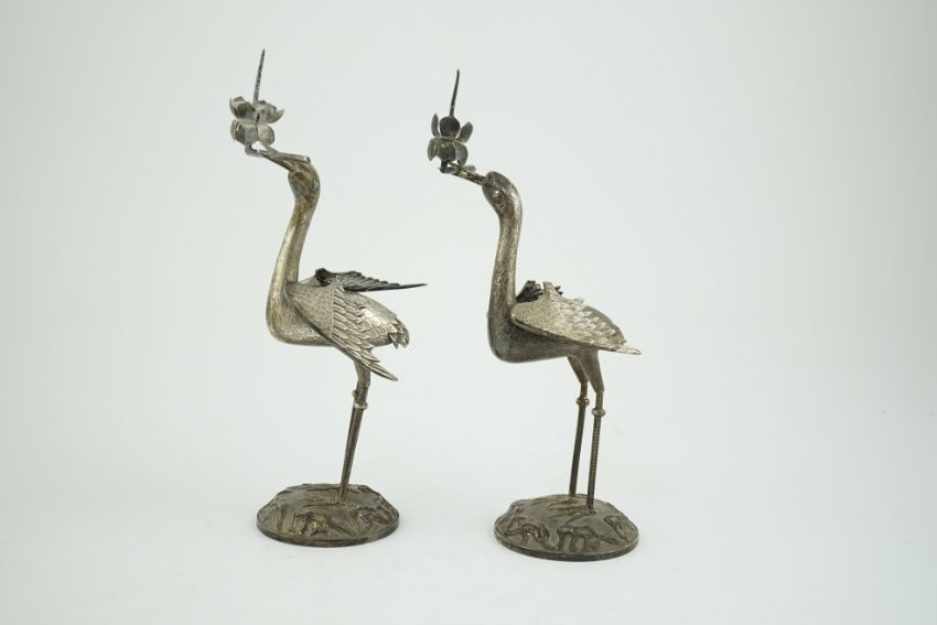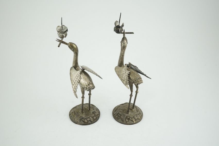 A pair of early to mid 20th century Japanese silver candlesticks, modelled as cranes, with detachable wings, one damaged, 26.9cm, 14.7oz.