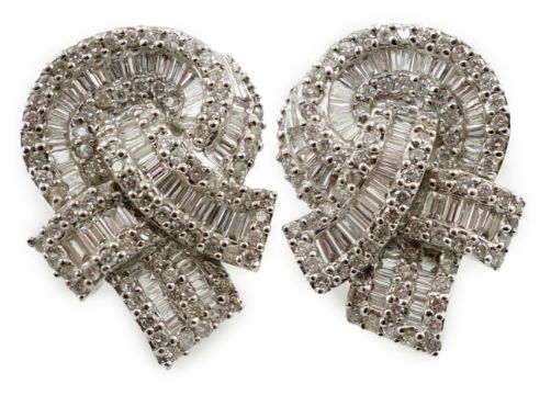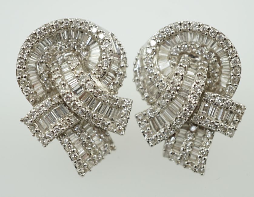 A pair of 18k white gold and pavé set round and baguette cut diamond cluster set 'knot' earrings, 25mm, gross weight 14.5 grams.