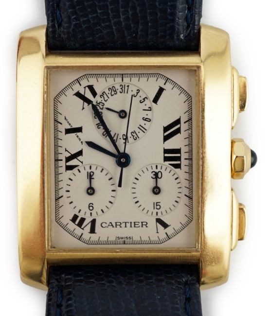 A gentleman's modern 18k gold Cartier Tank Francaise Calendar Chronograph quartz wrist watch, with rectangular Roman dial and three subsidiary dials, model no. 1830, the case back numbered 358899MG, case diameter 29mm, on an associated leather strap, with Cartier box and spare Cartier brown leather strap, no papers.**conditionreport**A few very minor surface scratches to the case in places, commensurate with age and little use. The hands don't seem to adjust when the winding crown is pulled out. The button functions work, but the hand does not reset to the beginning??, so in need of some attention.PLEASE NOTE:- Prospective buyers are strongly advised to examine personally any goods in which they are interested BEFORE the auction takes place. Whilst every care is taken in the accuracy of condition reports, Gorringes provide no other guarantee to the buyer other than in relation to forgeries. Many items are of an age or nature which precludes their being in perfect condition and some descriptions in the catalogue or given by way of condition report make reference to damage and/or restoration. We provide this information for guidance only and will not be held responsible for oversights concerning defects or restoration, nor does a reference to a particular defect imply the absence of any others. Prospective purchasers must accept these reports as genuine efforts by Gorringes or must take other steps to verify condition of lots. If you are unable to open the image file attached to this report, please let us know as soon as possible and we will re-send your images on a separate e-mail.