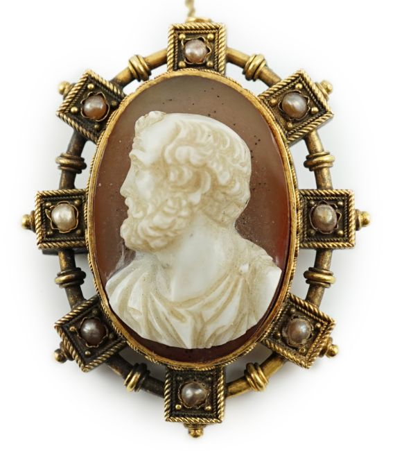 A Victorian gold and split pearl mounted oval hardstone cameo brooch, carved with the bust of a gentleman to dexter, 38mm, gross weight 15.2 grams.