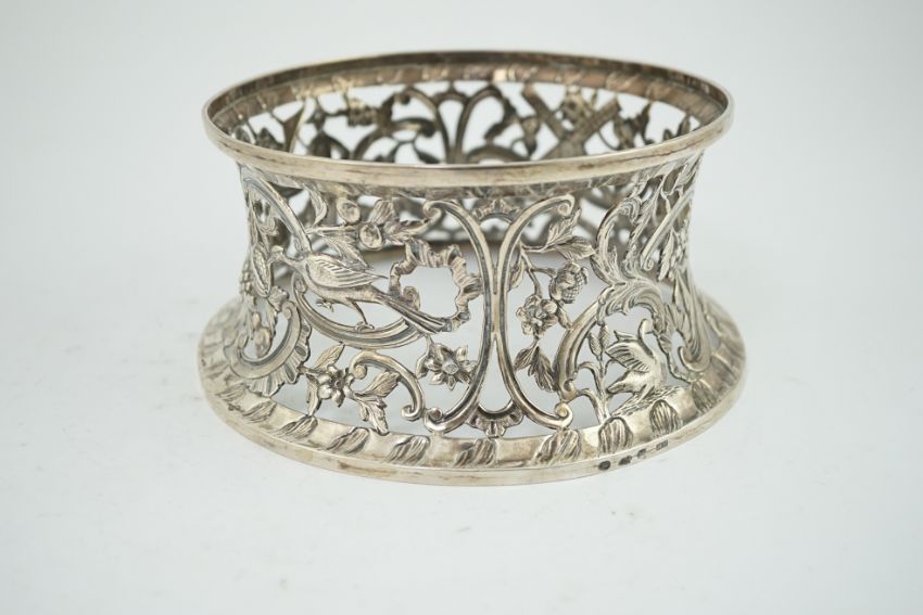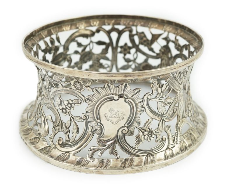 A George III Irish silver dish ring, by Matthew West, with engraved armorial and decorated with a Chinese figure, windmill and birds, all amongst foliage and scrolls, Dublin, 1772, diameter 18cm, 13oz.
