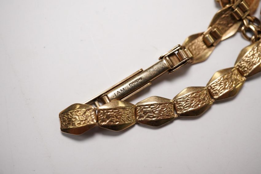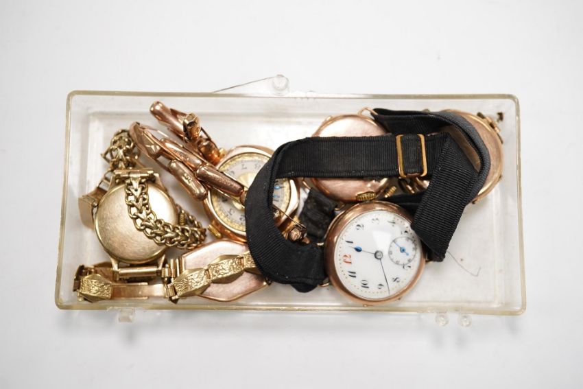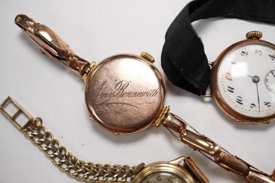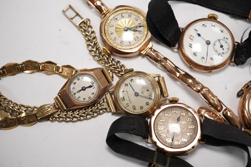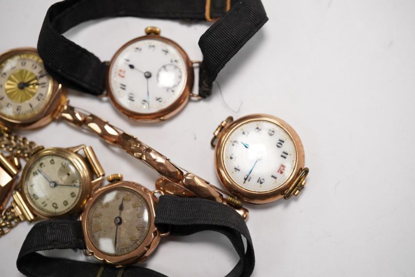 Six lady's assorted 9ct gold manual wind wrist watches, including three with 9ct bracelets, gross weight 88.9 grams. Condition - poor to fair