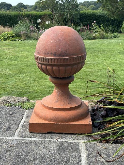 A large pair of Victorian terracotta ball finials, height 64cm, diameter 46cm. Condition -weathered, some chipping to the bases