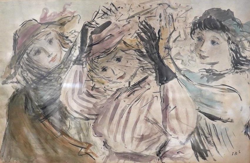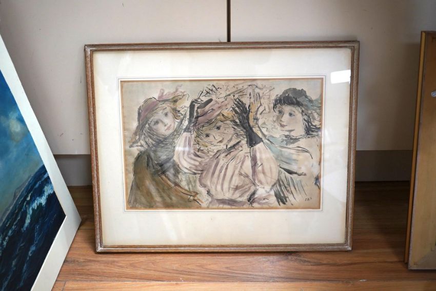 Elinor Bellingham Smith (1906-1988), watercolour, Study of three women, initialled, 26 x 39cm. Condition - fair