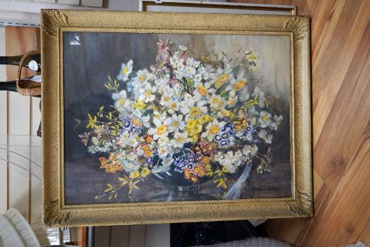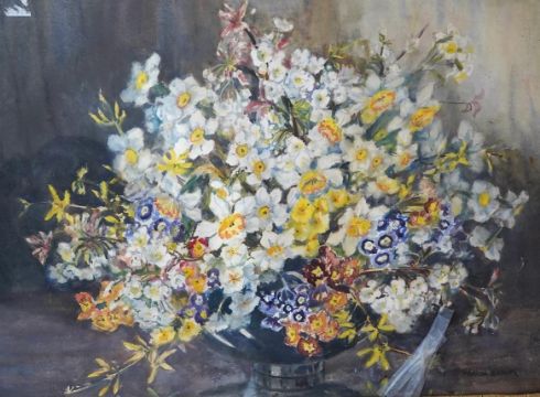 Marion L. Broom (1878-1962), watercolour, Still life of flowers in a bowl, signed, 54 x 73cm. Condition - fair, glass cracked