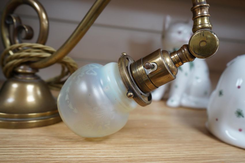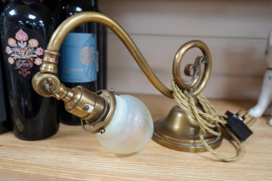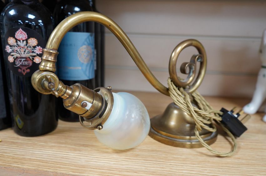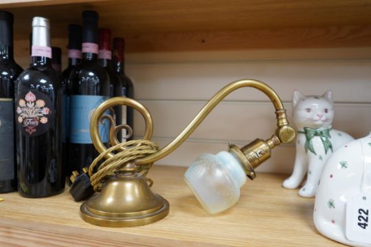 A brass piano lamp with original acid etched miniature Vaseline shade, circa early 20th century, wired, 20cm high, projection 43cm. Condition - fair to good, some minor nibbles to the shade