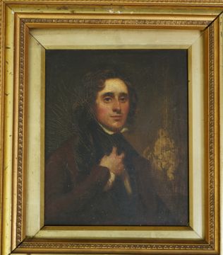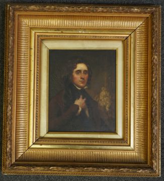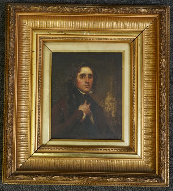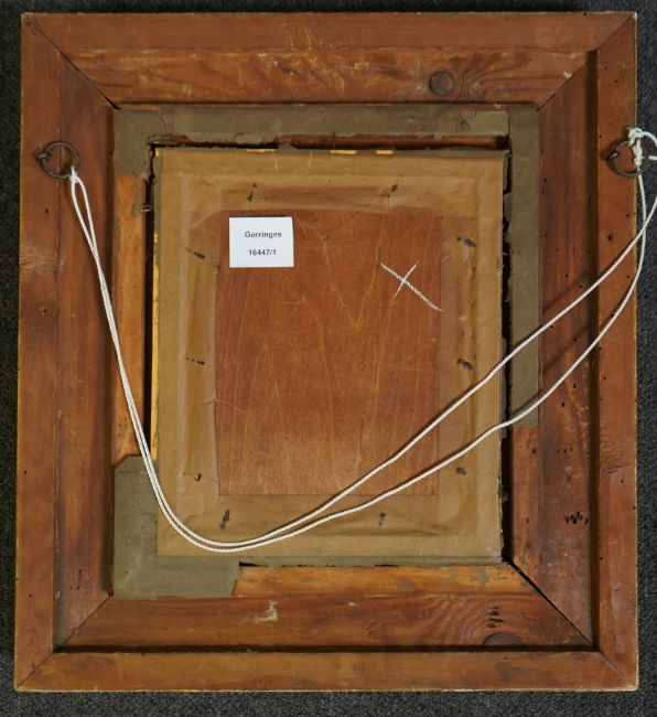 Oil on wooden panel showing very slight outward bulge in the centre, paint rather dirty with a fine but stable craquelure running throughout, apparently unsigned, housed in a later gilt gesso frame which is in fair order.