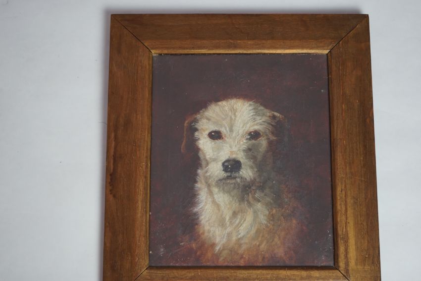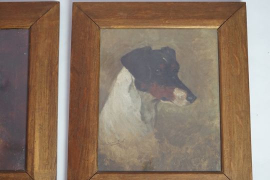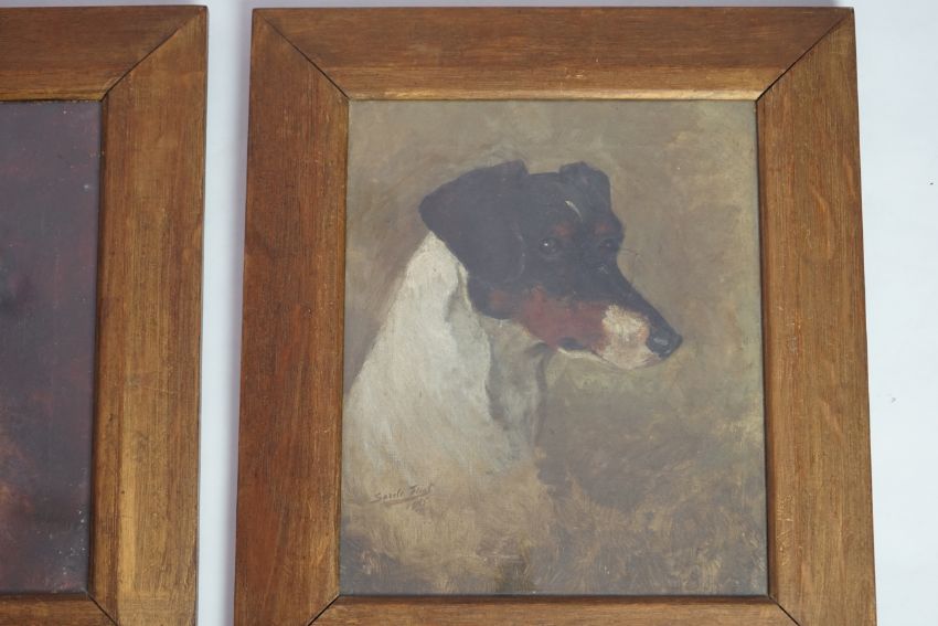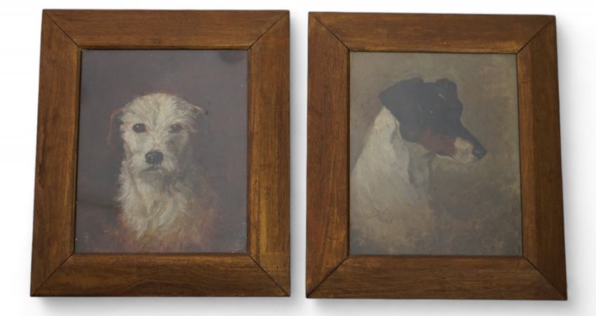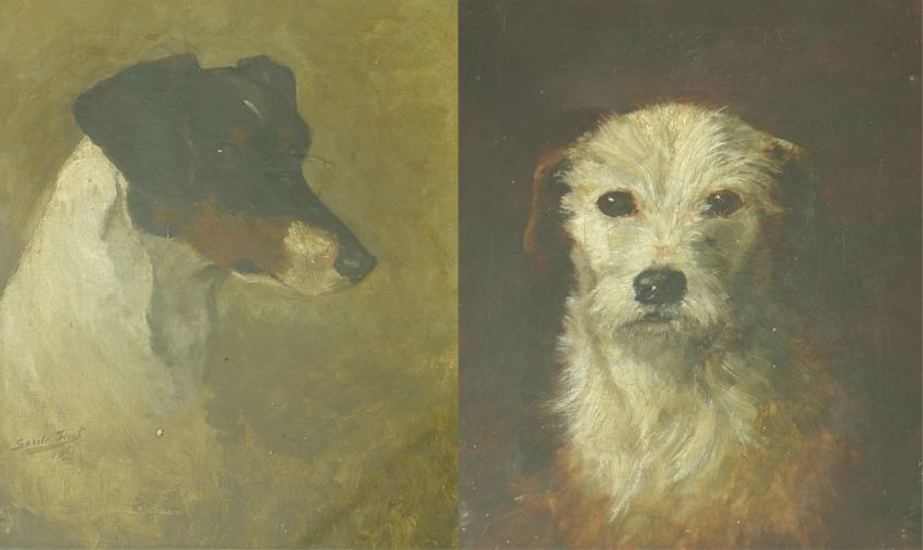Both in need of a good clean with some slight undulation and stretcher marks showing, fox terrier has a tear through its muzzle that has been patched and retouched, is signed and dated. The white terrier with a patched dent above its right ear, equally retouched but not particularly well, both under glass in plain gilt oak frames