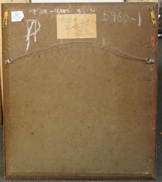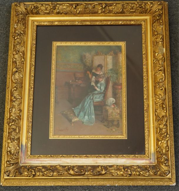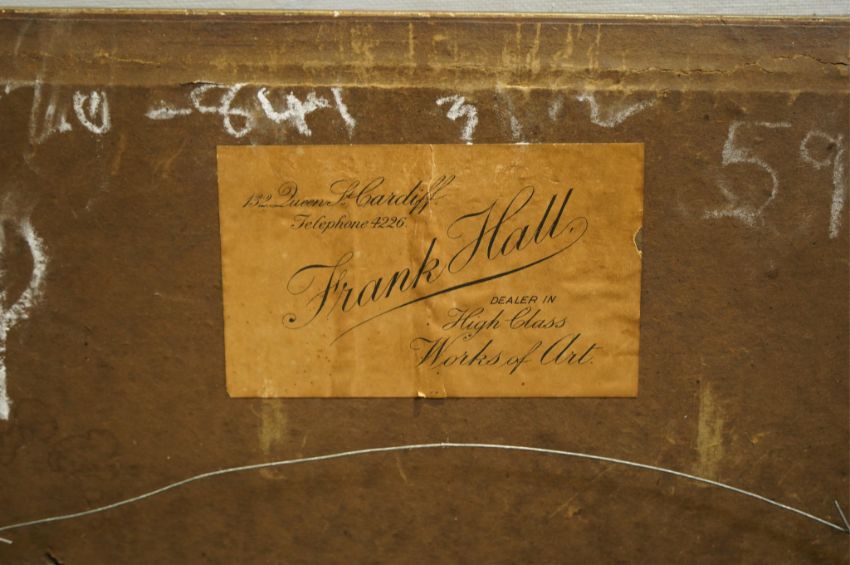 Very good untouched condition, possibly needing a light clean but no real faults noted, under glass in the highly ornate gilt scroll frame which has some losses, old label verso for Frank Hall of Cardiff