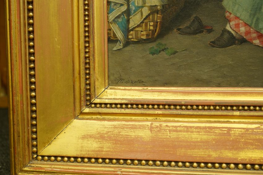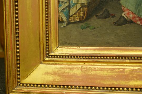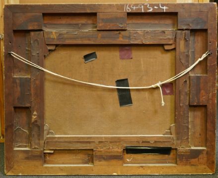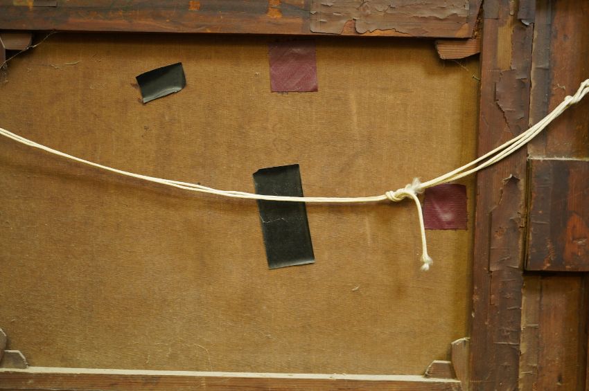Oil on original canvas with a number of patched and retouched repairs, clearly visible when viewed from behind, otherwise paint a little dirty, canvas slightly saggy with some small scuff marks, and surface dirt and dust, clear patches verso, probably the original gilt frame in fair order with remnants of an old label.