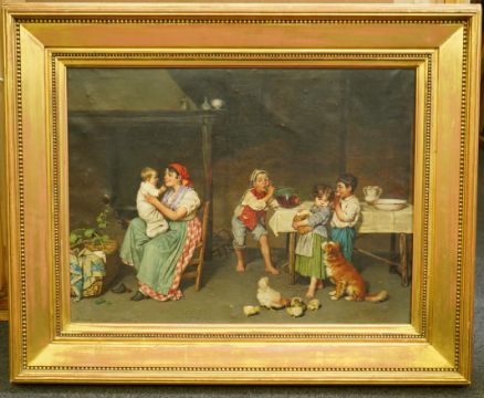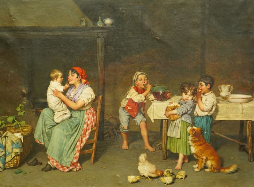 Interior with mother and children, dog and chickens