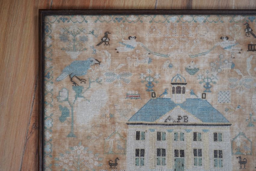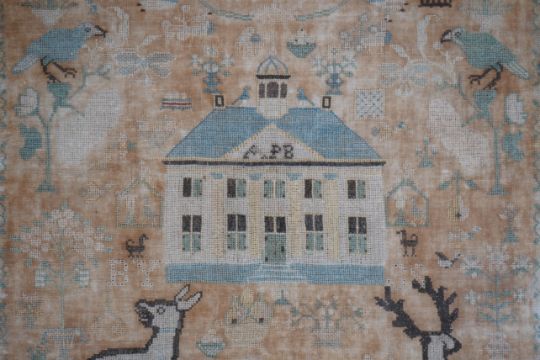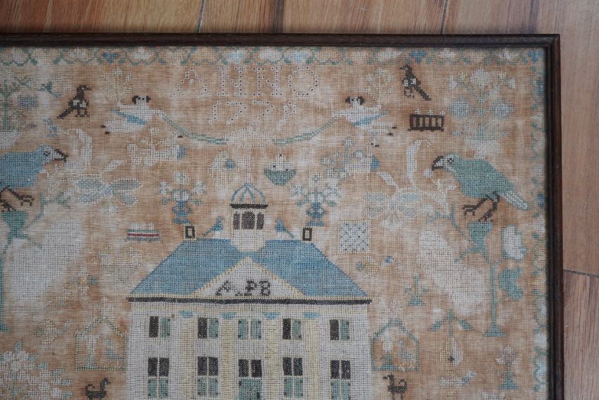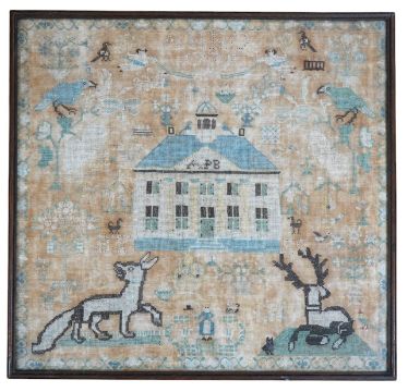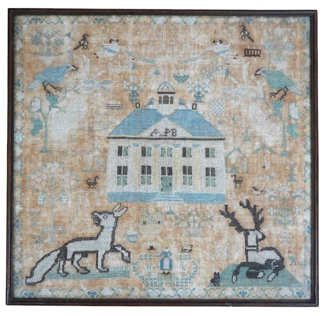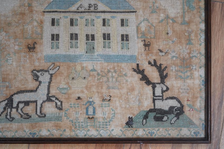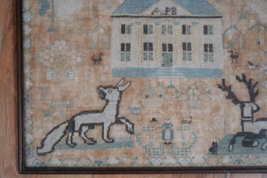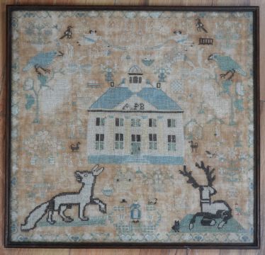 A framed 18th century sampler, dated 1779 by SS., worked in fine cross stitch with motifs of angels, figures, flowers, trees birds a fox and a stag surrounding a house with initials APB. 39cm x 37.5cm. Condition - the embroidery and backing are good but the backing cloth is badly stained which maybe professionally cleaned