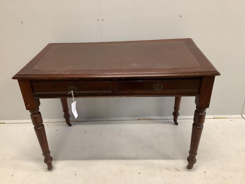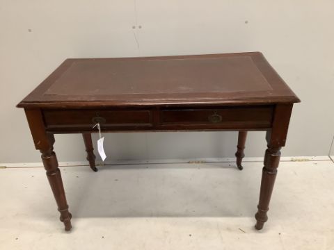 An early 20th century mahogany writing table with two frieze drawers with brass ring handles on turned legs and castors, width 106cm, depth 59cm, height 75cm. Condition - fairProvenance: Constables Tower, the main entrance gate to Dover Castle, was constructed in 1220 and was traditionally for the use of the Constable of Dover Castle. From the mid-eighteenth century to 2015 it was the home of the Deputy Constable of the Castle, and their families. Serving as a private residence, office, and reception space for formal events and ceremonies, over the years visitors have included leading figures from Admirals to Bishops and even Royalty.The building and its contents were transferred to English Heritage in 2015 and an assessment of the historical significance of the building and its contents have taken place. The furniture being offered for sale was all in use in the building, offering a tangible connection to the history of the place. However, it is not sufficiently historically important to be brought into the museum collection for Dover Castle. The proceeds from the sale of this furniture, will enable English Heritage – itself a charity – to fund the conservation and care of the objects from Constables Tower which are particularly historically significant.