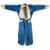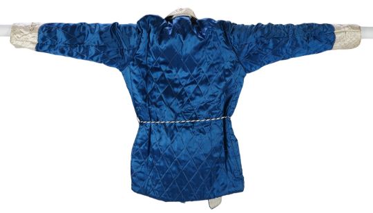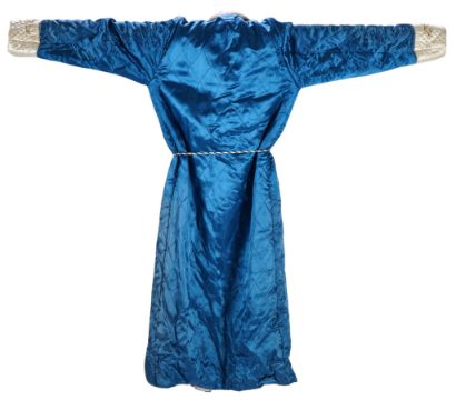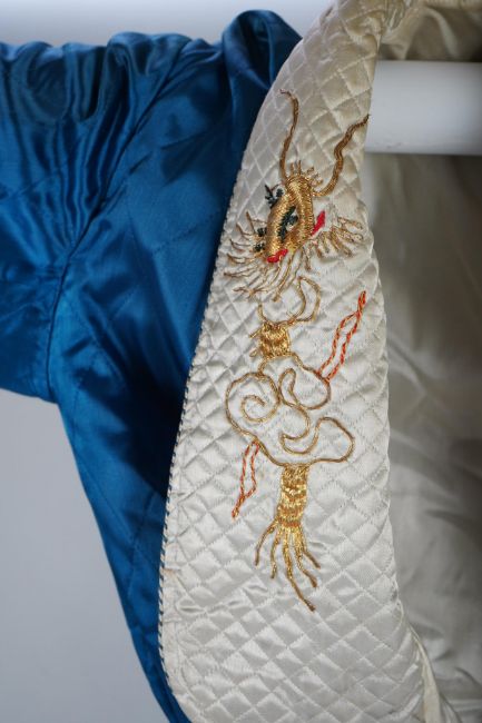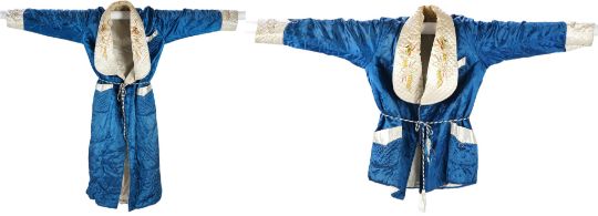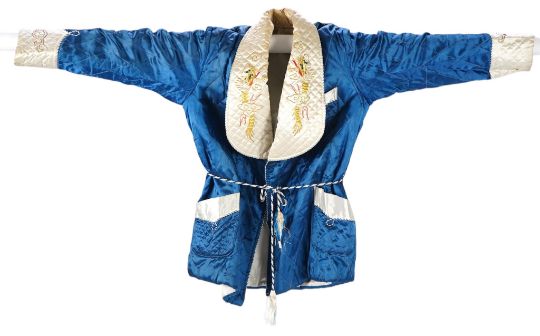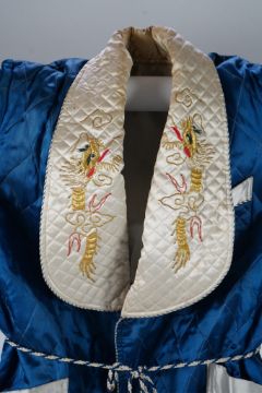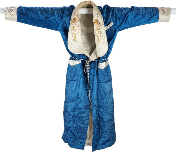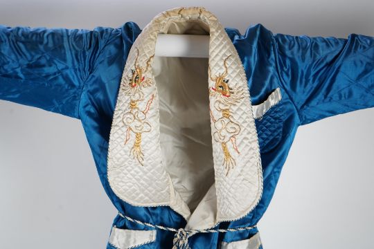 A mid 20th century Royal blue satin gentleman’s smoking jacket and matching dressing gown with Chinese gold dragon embroidery to both the quilted collars and cuffs, measurement from top back of collar to bottom of dressing gown 56 inches.Condition - both the collars at the back of both garments are badly stained and need washing or re-covering and one cord tie belt needs replacing.Shoulder seam to shoulder seam 46cm approx.. Armpit to armpit 53cm approx.Some typical signs of wear consistent with use, discolouration and yellowing to the lighter fabric especially around the collar. Some stitching has become unpicked in places.