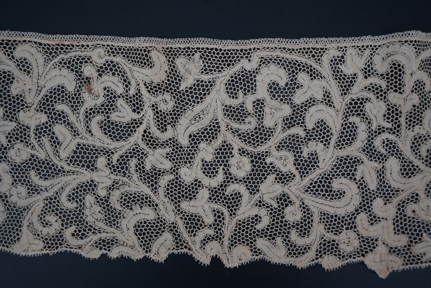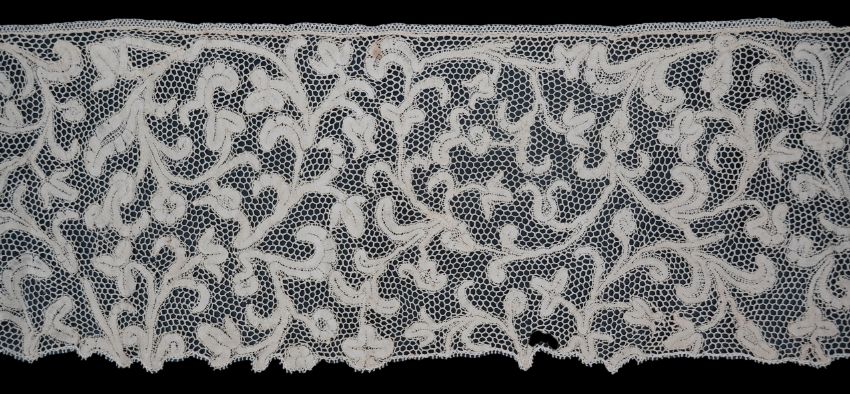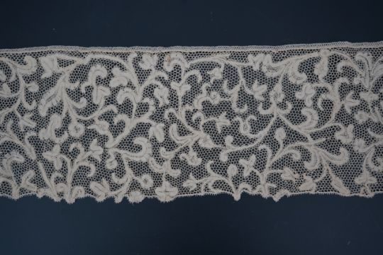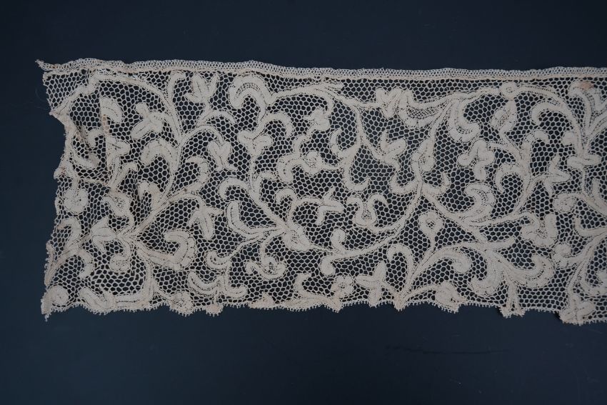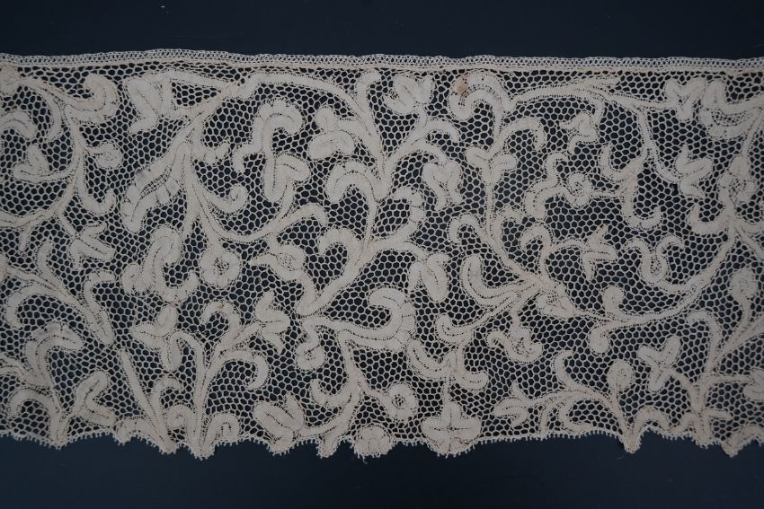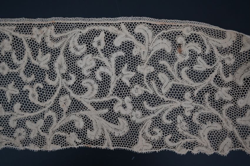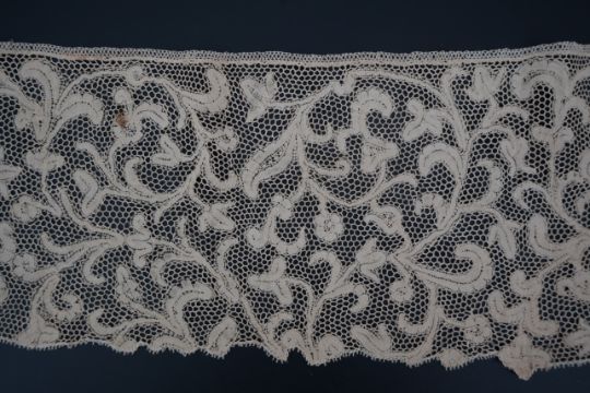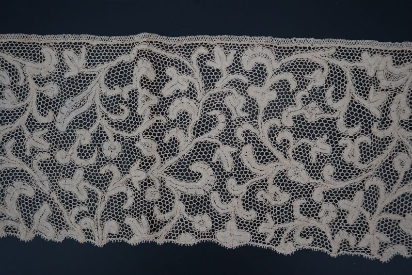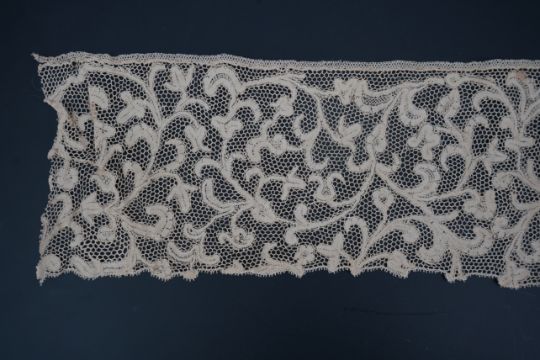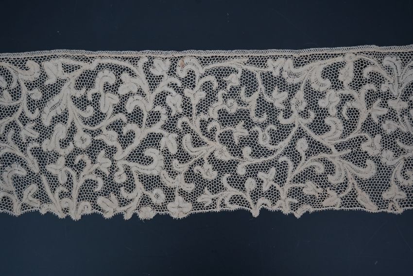 A length of 1740-1760 Italian, Milanese bobbin lace flounce, made from flat braiding or tapes, placed into scrolling patterns, attached to brides, made into a honeycomb mesh. 252cm long x 16cm deep. Condition - one small brown stain, which could be professionally removed, there are no breaks or mends. The lace feels unused