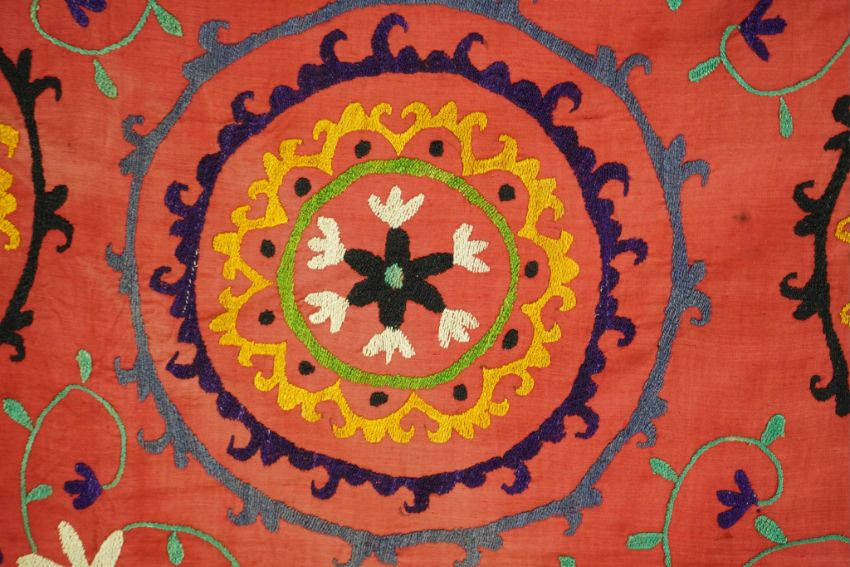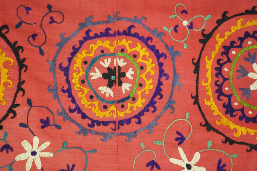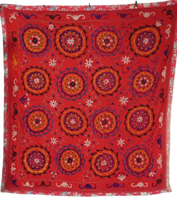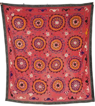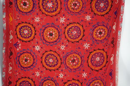 A large 20th century Uzbek multi coloured and embroidered Suzani wall hanging. The word Suzani meaning needlepoint in Farsi. Made in three panels embroidered on a rich dark red background, using large stylised multi coloured decorative boteh motifs, finely edged in black. 176cm x 194cm. Condition - some very slight fading to background cloth, due to age and use, embroidery strong in colour with no damage.