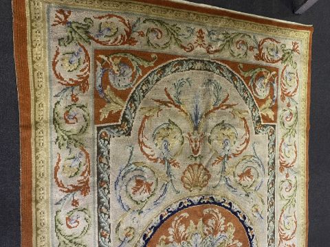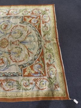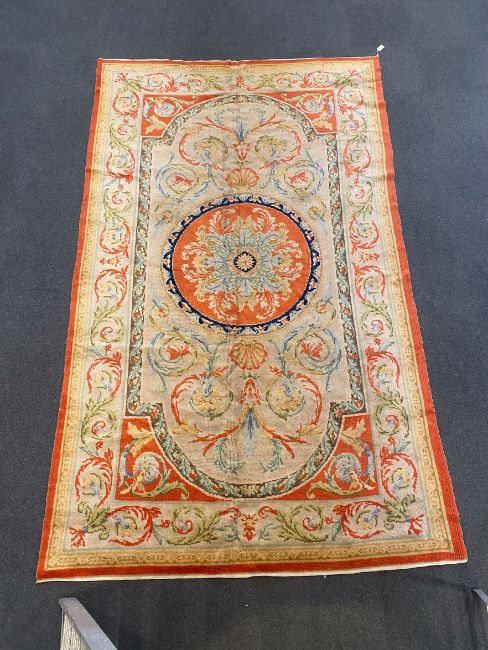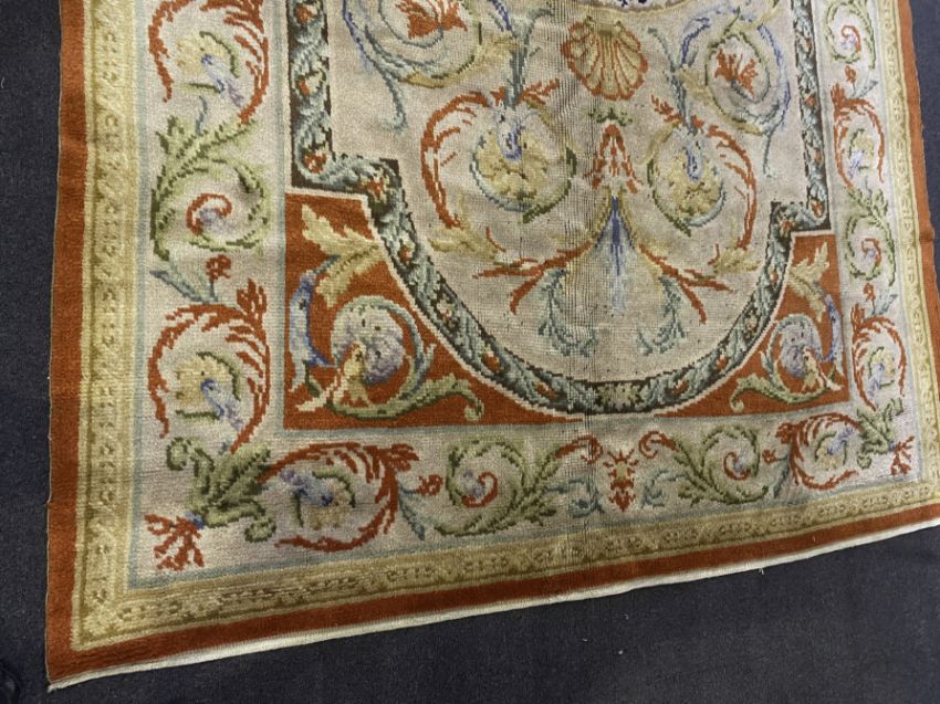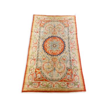 A Savonnerie carpet, with central rosette on a field of scrolling shell and foliate motifs, 372 x 220cm