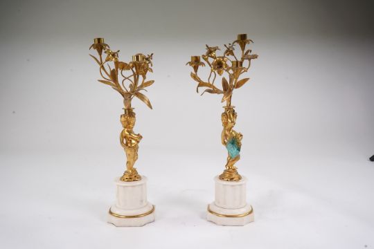 Both look to date to the mid 20th century, ormolu fairly bright but some oxidisation to the upper surfaces particularly of the branches, no sign of any sconces, one flower stem is now broken away and loose, one figure has distinct verdigris banding running through it, bases with very light pitting but essentially fair order.