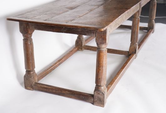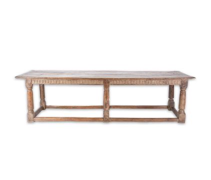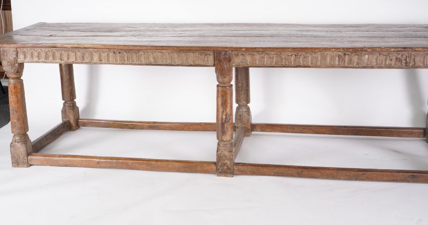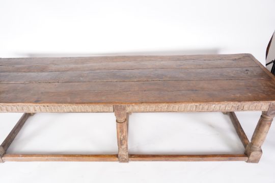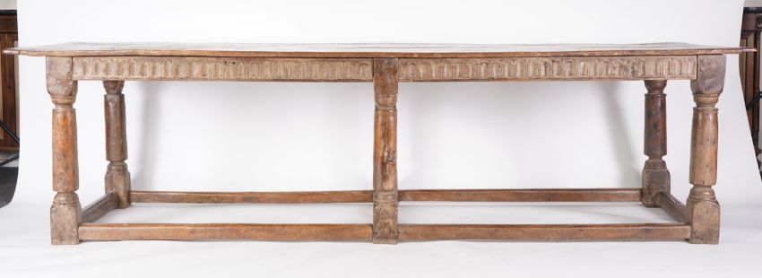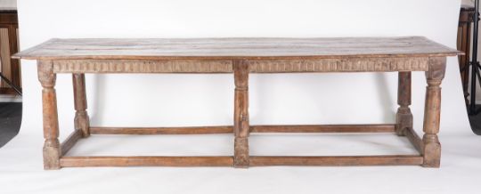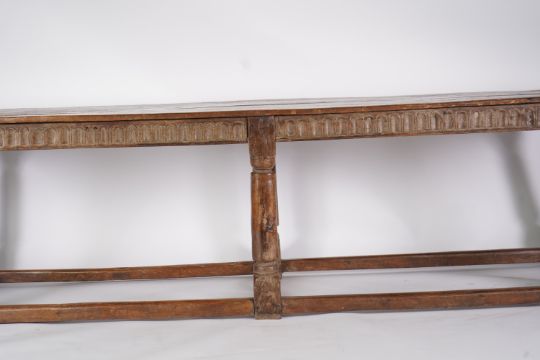 Probably dates to the 19th century and is constructed partially with older timbers, attractive overall appearance, the top is somewhat weathered with splits running through the grain and old worm holes throughout, tips to each end look like replacements, frieze is a little shallowly carved and somewhat worn, under frame with old wear commensurate with use, feet probably somewhat cut down.