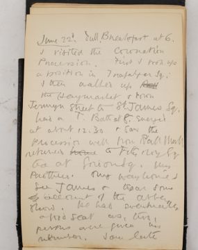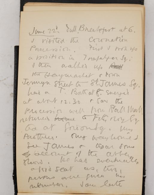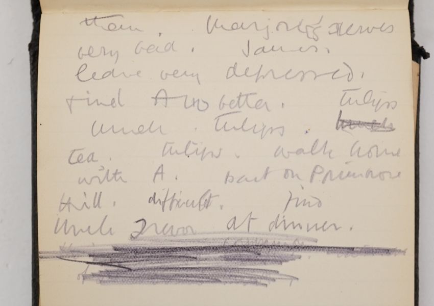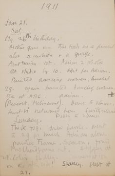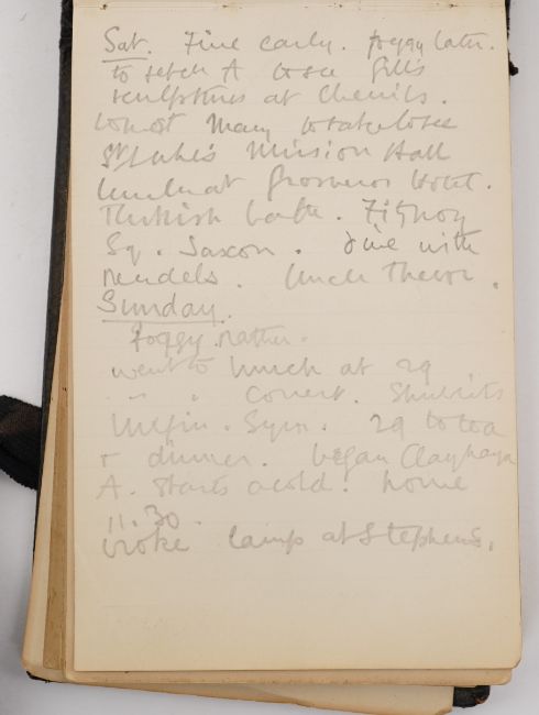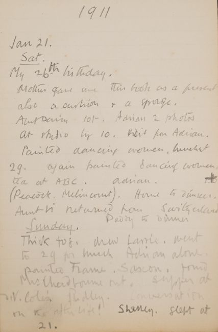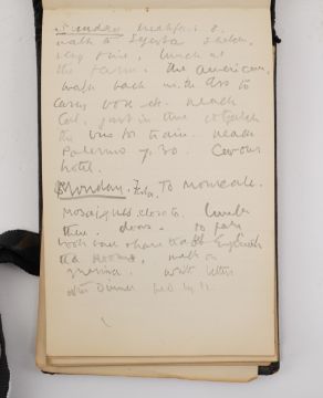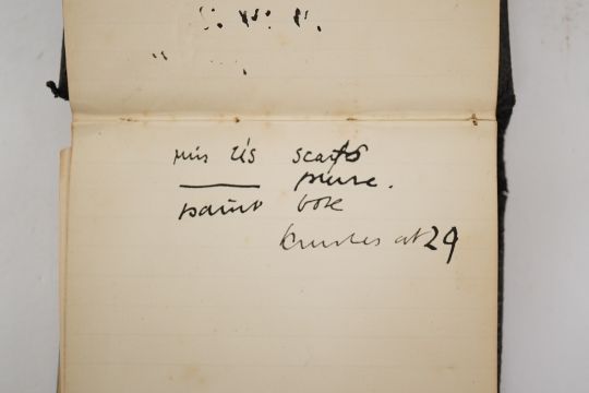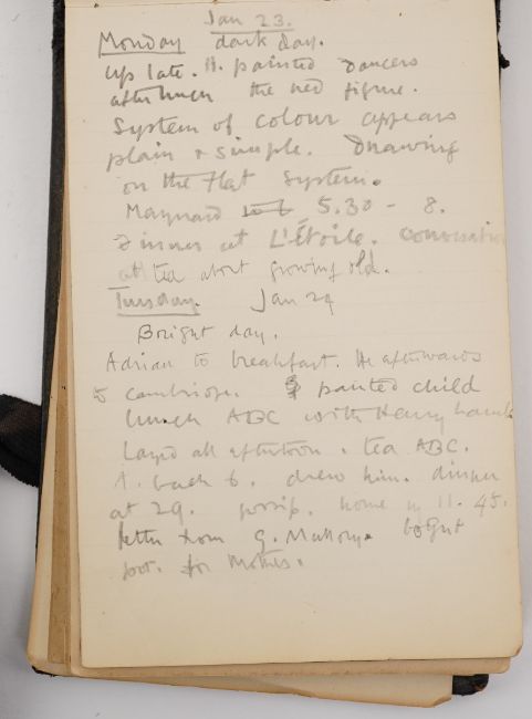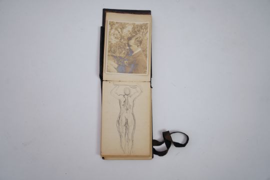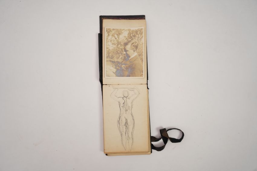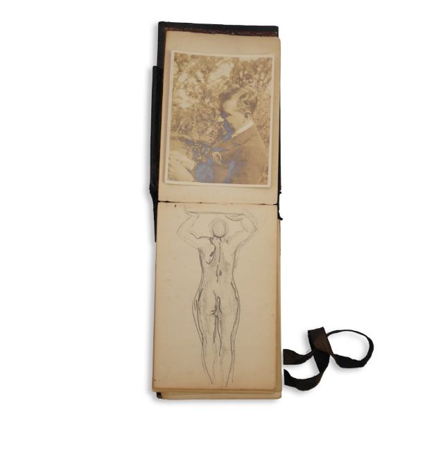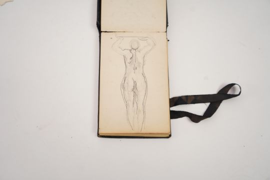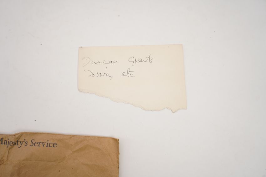 Duncan Grant, a black cloth bound lined paper notebook, used by the artist as a diary, with pencil sketch of a standing nude and entries dating from 21st January 1911, commencing with the artist's 26th birthday stating 'Mother gave me this book as a present also a cushion plus a sponge ...', entries run through to October 10th and mostly recount meetings and thoughts of the day, 15 x 10cm Overall honest condition, the spine just starting to loosen and the front board pulling away, some discolouration around the edges of the pages, all inscriptions are in pencil but for a few notes on a back page in ink, also houses a photograph with inscription on the back 'Morgan Forster Charleston Garden 1923'.PLEASE NOTE:- Prospective buyers are strongly advised to examine personally any goods in which they are interested BEFORE the auction takes place. Whilst every care is taken in the accuracy of condition reports, Gorringes provide no other guarantee to the buyer other than in relation to forgeries. Many items are of an age or nature which precludes their being in perfect condition and some descriptions in the catalogue or given by way of condition report make reference to damage and/or restoration. We provide this information for guidance only and will not be held responsible for oversights concerning defects or restoration, nor does a reference to a particular defect imply the absence of any others. Prospective purchasers must accept these reports as genuine efforts by Gorringes or must take other steps to verify condition of lots. If you are unable to open the image file attached to this report, please let us know as soon as possible and we will re-send your images on a separate e-mail.