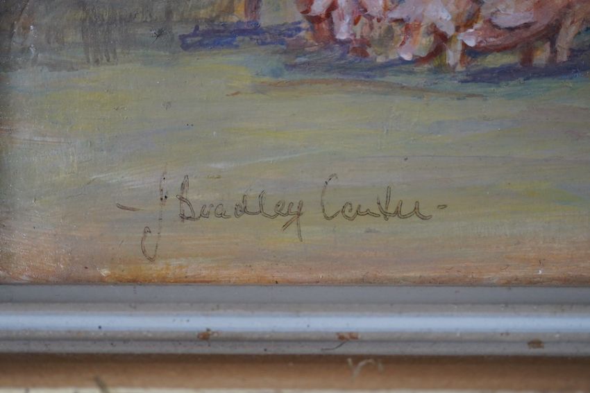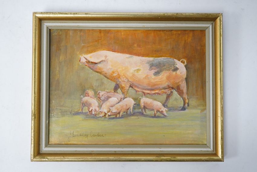 Miniature impressionist oil on board, Study of a sow and piglets, indistinctly signed J. Bradley ...?, 10 x 14cm. Condition – good