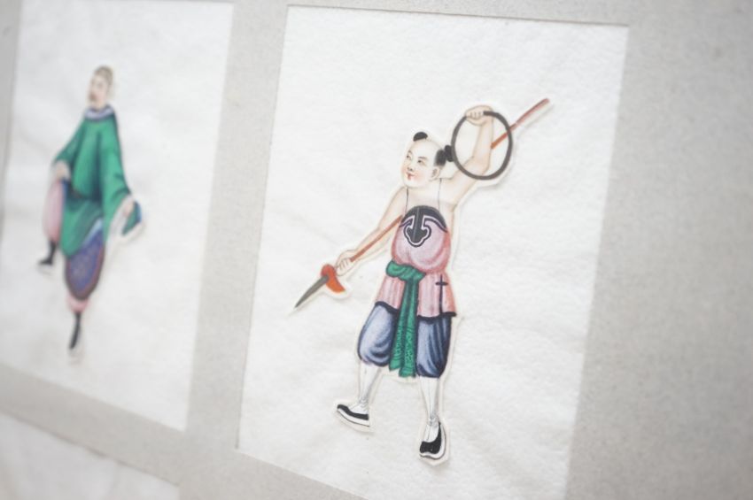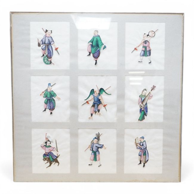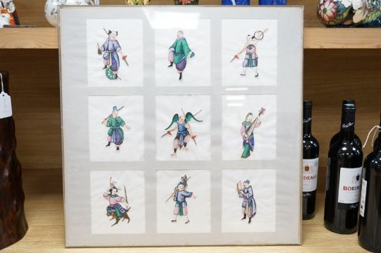 Nine Chinese pith paper painted appliqués, mounted and framed as one, performers and musicians, each 14 x 11cm. Condition - fair, paintings cut out