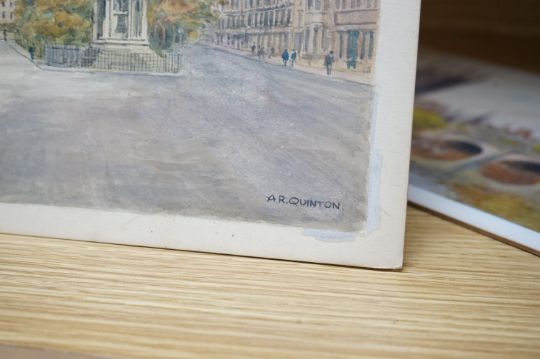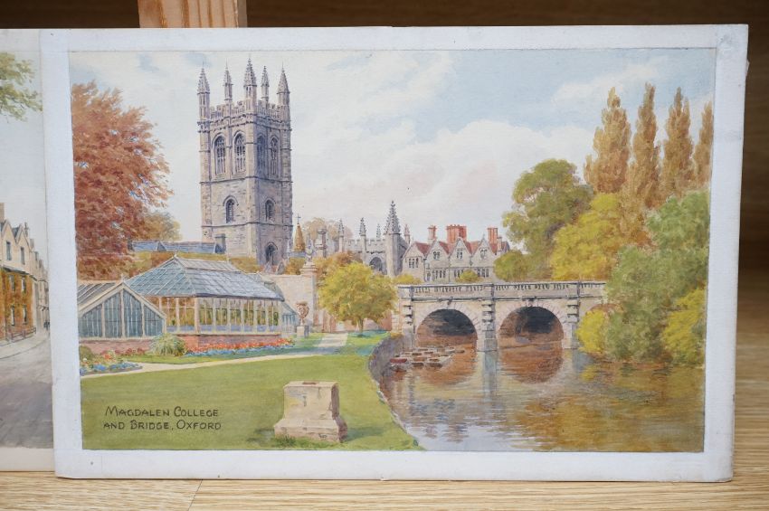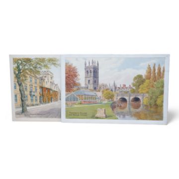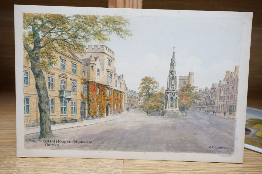 Alfred Robert Quinton (1853-1934), two watercolours for postcard designs of Oxford scenes; ‘Magdalen College and Bridge, Oxford’, and ‘Balliol College & Martyrs’ Memorial, Oxford’, one signed, 18 x 28cm, unframed. Condition - fair, minor discolouration