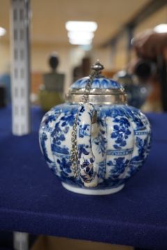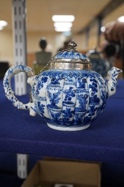 A Chinese blue and white teapot, Kangxi with white metal mounting. 12cm high. Condition - restored