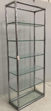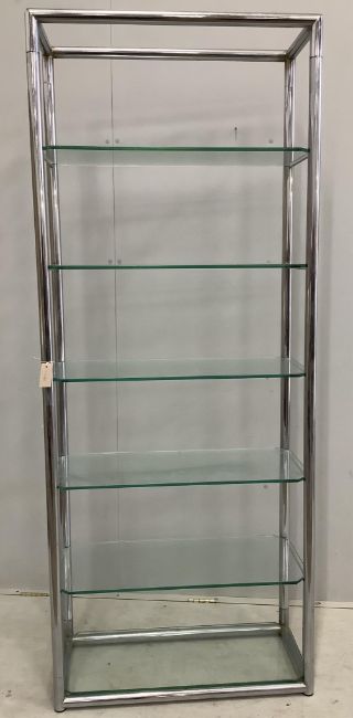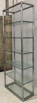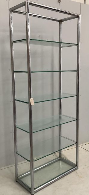 A contemporary chrome and clear glass five tier open shelf unit, width 79cm, depth 33cm, height 200cm. Condition - fair