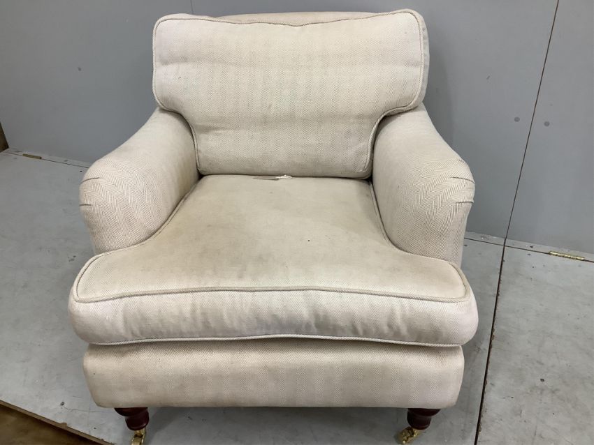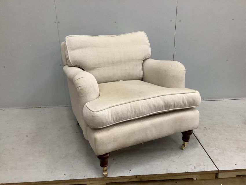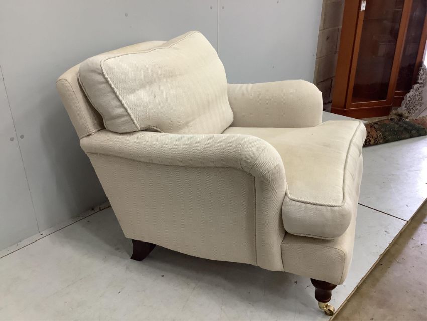 A reproduction Howard style upholstered armchair, width 86cm, depth 100cm, height 82cm. Condition - fair