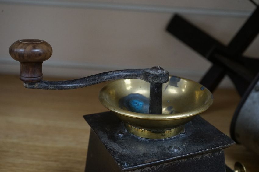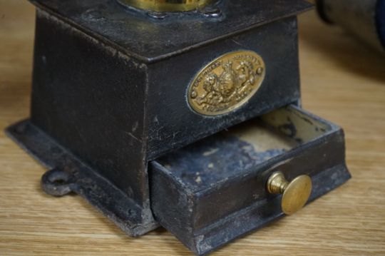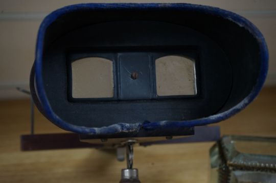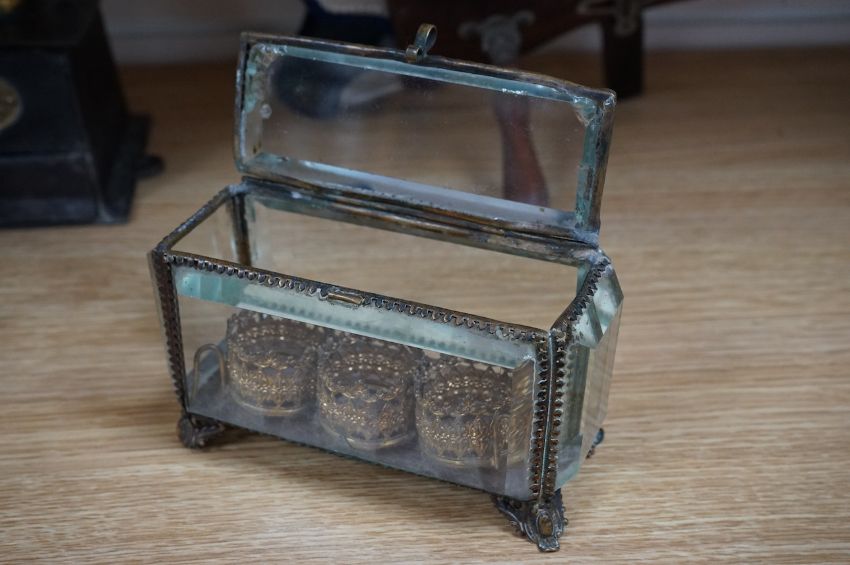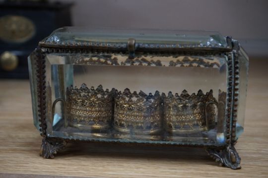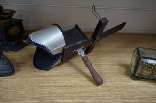 A Paris glass box of perfume bottle containers, a coffee grinder and a glazed box and a stereoscope- 32cm long. Condition - glass box chipped