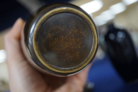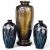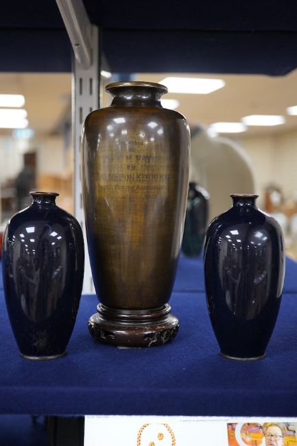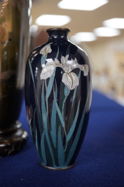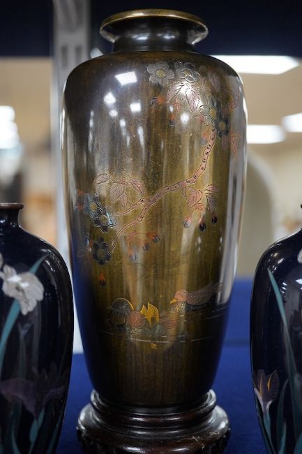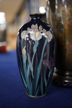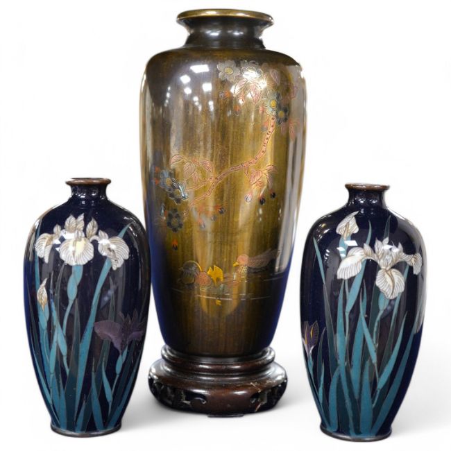 A Japanese presentation bronze and mixed metal vase on hardwood stand and a pair of cloisonne enamel vases (3), tallest 20cm. Condition - fair to good