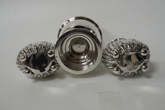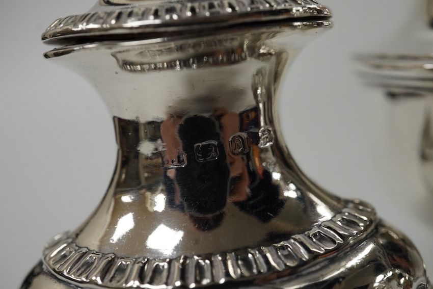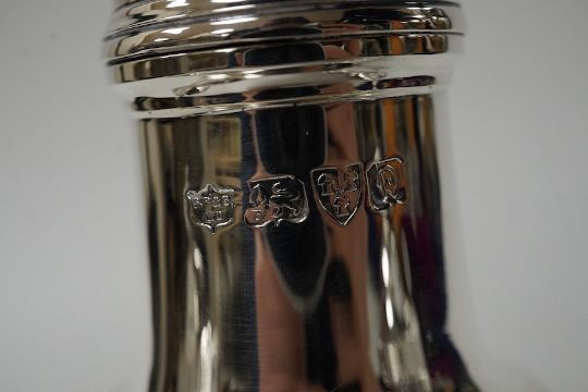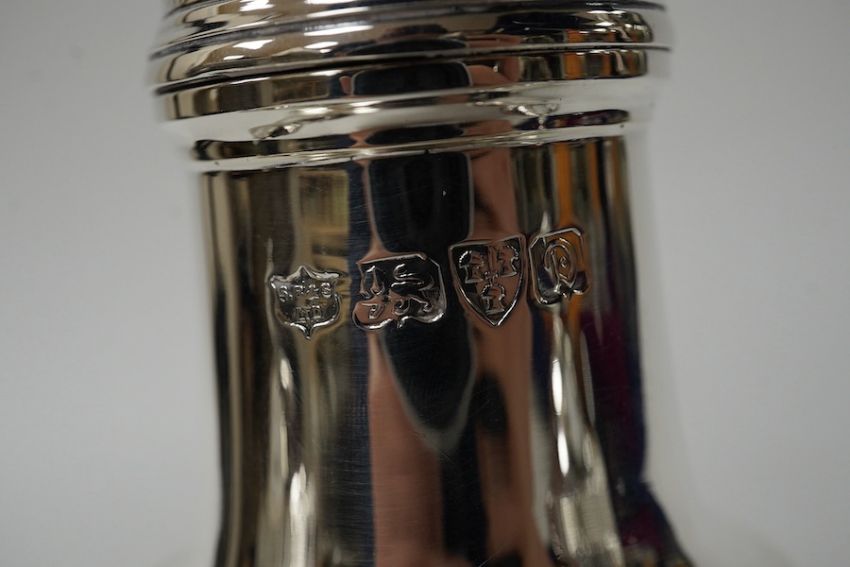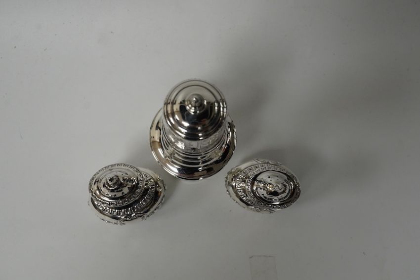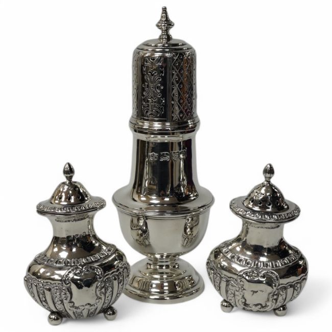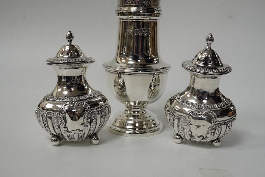 A George V silver sugar caster, by S. Blanckensee & Sons Ltd, Chester, 1929, 15.9cm and a pair of small late Victorian silver pepperettes, 8.4oz. Condition - poor to fair
